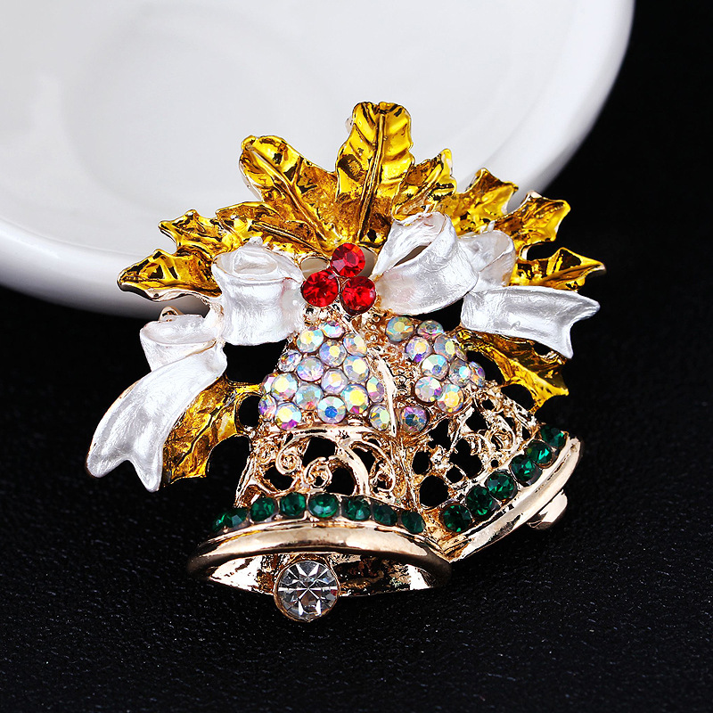 Exklusiv julbrosch med kristaller – Glittrande julklockor, gyllene löv & rosett