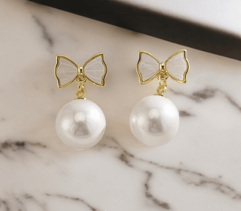 Härligt örhänge med pärla och rosett i pärlemo. Upptäck Tidlös Elegans! Vårt exklusiva örhänge med pärla och pärlemo är den perfekta accessoaren för att lyfta din stil till nya höjder. Med högkvalitativt metall och en strålande akrylpärla är detta örhänge en subtil men elegant touch för alla tillfällen. Köp nu och låt din elegans skina!