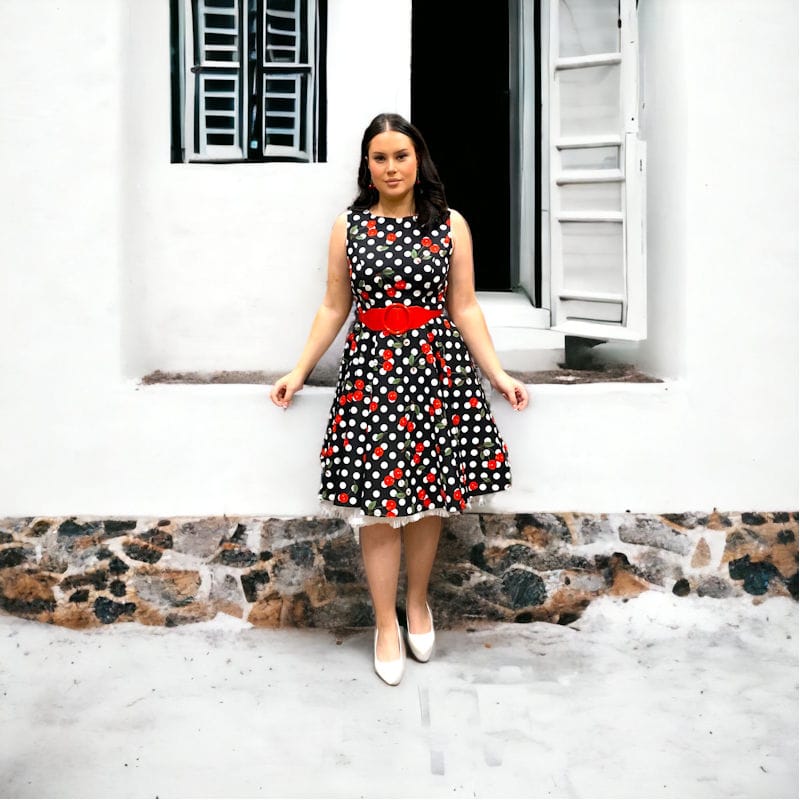 Snygg helcirklad svart klänning i stor storlek med stora vita prickar och härliga röda körsbär. Tillverkad i ett mycket lätt elastiskt tyg. Dragkedja bak. Bälte du ser på bilden följer med som också är avtagbart. En äkta klassiker som aldrig går ur tiden. För maximal volym och swingen, köp till en underkjol, till denna klänning passar 60 cm lång. Mixa och matcha med våra härliga accessoarer. Material: 95% bomull och 5% spandex. Tvättråd: 30 grader fintvätt. Går bra att stryka på svag värme, ett tips använd gärna ett lättfuktad bomullshandduk och lägg mellan klänning och strykjärnet. Fler läckra klänningar i samma modell finns i olika fler färger och mönster, under fliken plus size dam.Du kanske också gillar …