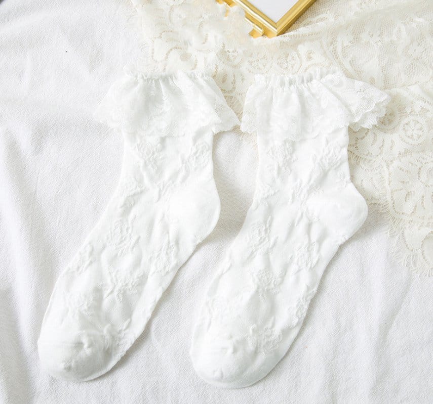 Vita strumpor rosor spetskant och spetsvolang. Kan används till pumps, ballerinaskor och sneakers. Mixa och matcha med våra övriga 50 tals accessoarer.